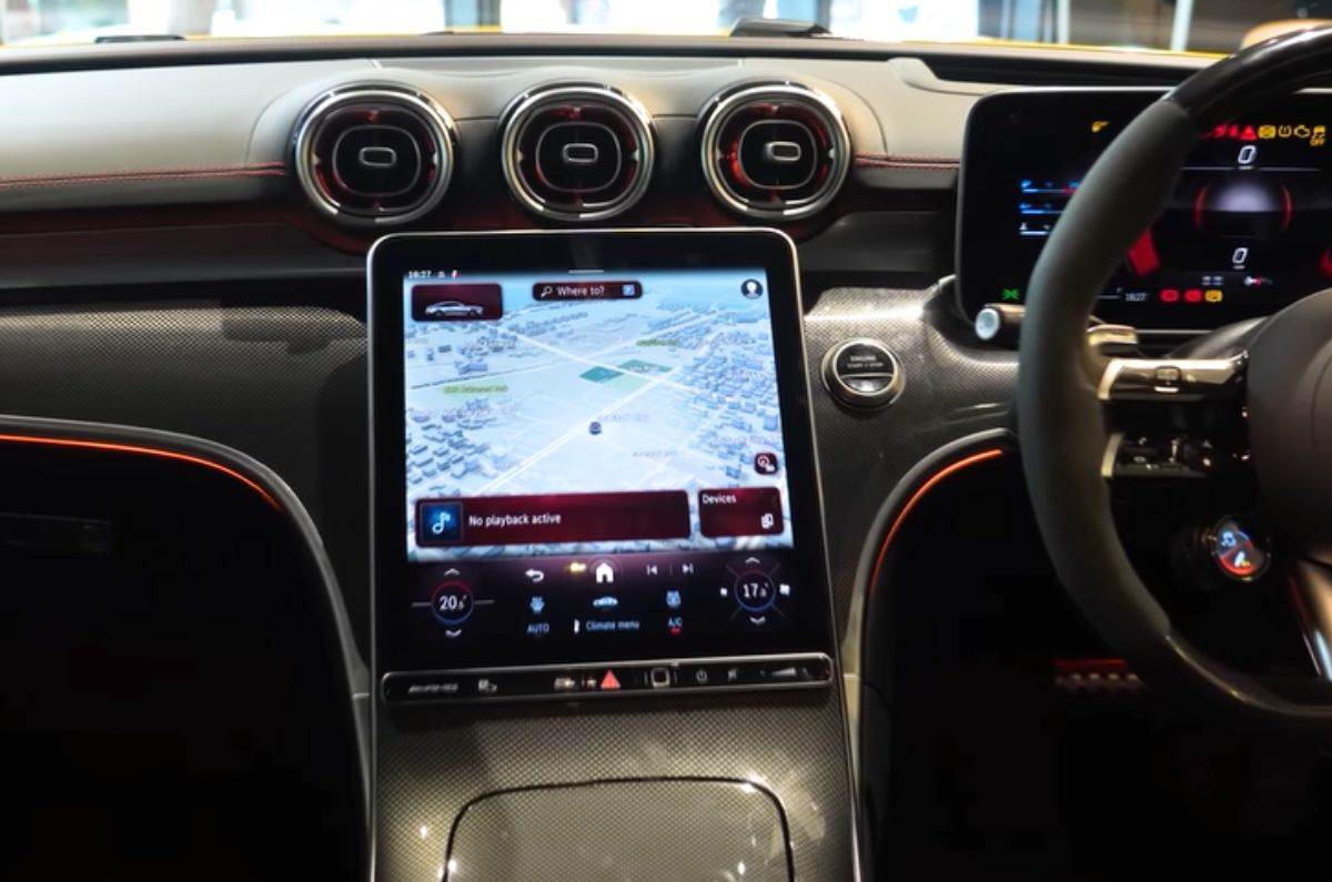 On the inside, the CLE 53’s dashboard looks very similar to that of the C-Class with the 11.9-inch portrait oriented central touchscreen, the circular AC vents and the 12.3-inch, free-standing digital driver’s display. What is different, though, is this four-spoke AMG-spec steering wheel. Like every other AMG car, the steering gets two rotary dials to toggle through the drive modes and suspension and exhaust setting. The steering also houses capacitive touch buttons which we are not a fan of – they are quite fiddly to operate.