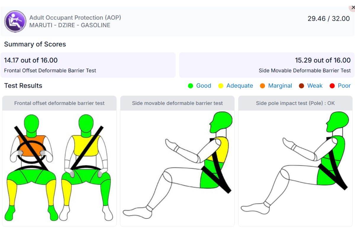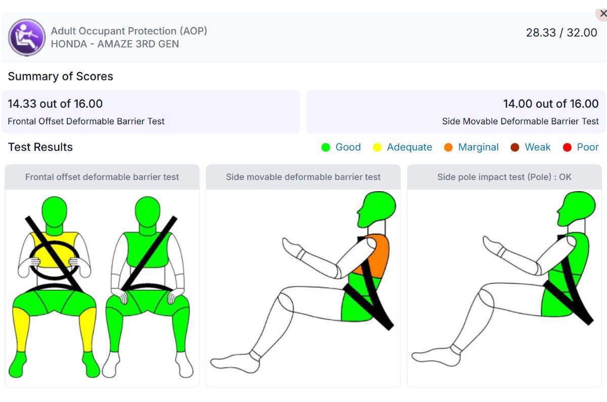 A detailed breakdown of the adult safety scores shows that the Amaze has achieved 0.16 points more in the frontal offset deformable barrier test, while the Dzire fared better in the side movable barrier test by 1.29 points.